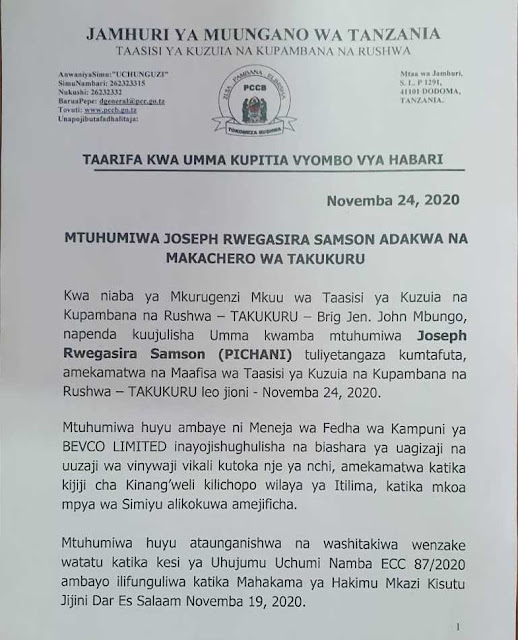 Soma zaidi hapa chini taarifa iliyotolewa leo Novemba 24, 2020 kwa vyombo vya habari na Afisa Uhusiano TAKUKURU, Doreen Kapwani kwa niaba ya Mkurugenzi Mkuu wa taasisi hiyo.