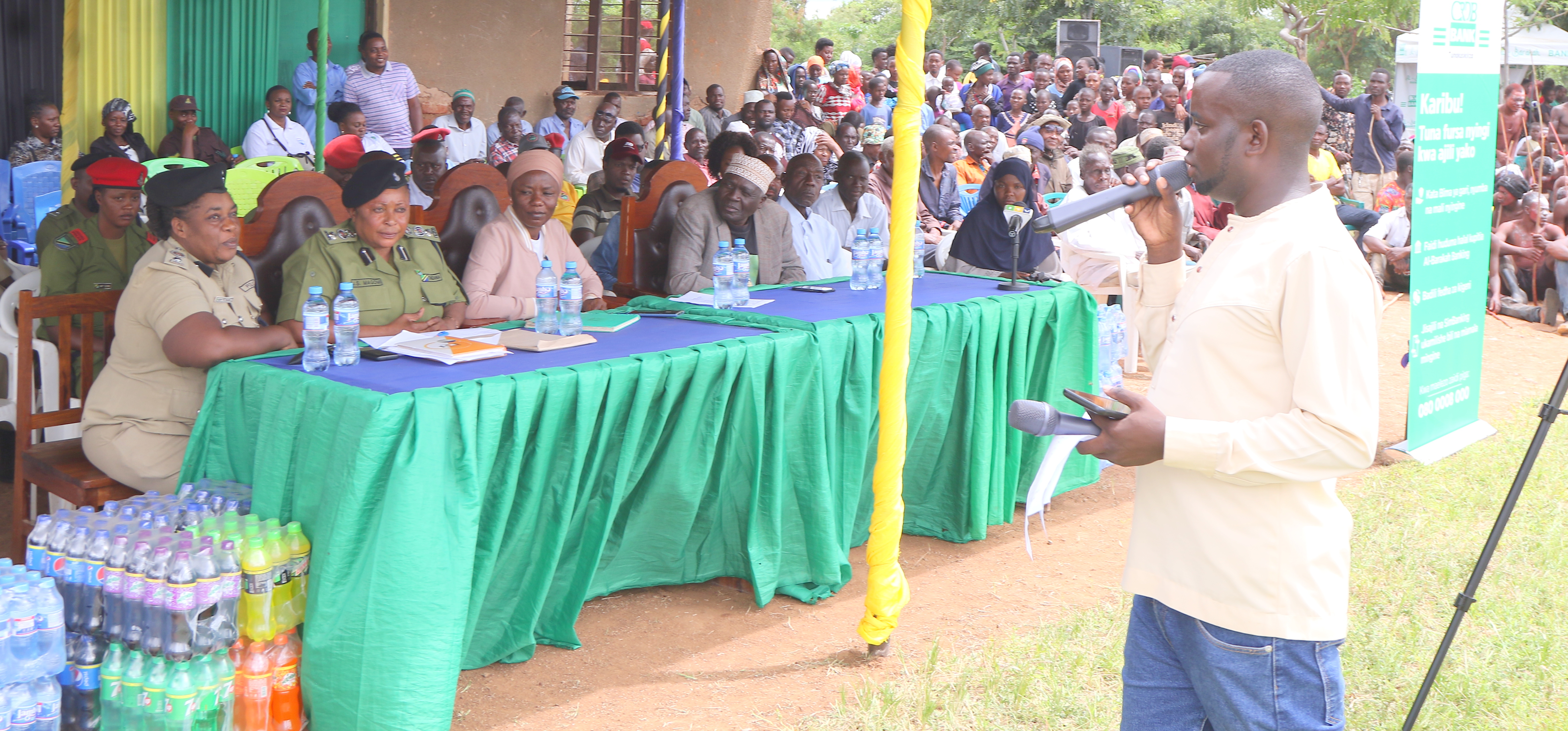 Mratibu wa Kampeni, MC Amos Events maarufu MC Mzungu Mweusi akizungumza wakati wa Bonanza la Michezo likiongozwa na Kampeni ya Kataa Uhalifu Toa Taarifa Shinyanga Bila Uhalifu Inawezekana’ leo Aprili 15,2023 katika kata ya Chibe Manispaa ya Shinyanga. Kushoto ni Polisi Kata ya Chibe, Mkaguzi Msaidizi wa Polisi Issa Mnafi.